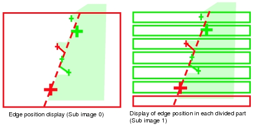 In addition to the camera input image, the measured region, a graphic display of the measured results, and the edge position (the cross-shaped cursor) are also displayed as results in the "Image Display" area.